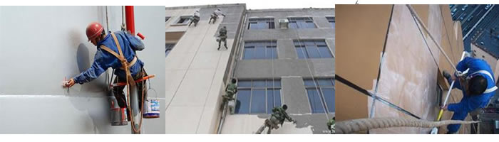 5、安全事項;本施工為吊掛高空作業(yè),安全特別重要。除了工作繩還必須有保險繩,少為兩人三繩(公用一根保險繩)所有的繩子要分開系牢于能夠承重的固定物件上,繩子與物件的銳角之間一定要墊上厚厚的毛毯,以防銳角對繩子劃傷,杜絕隱患!下吊一定要有監(jiān)護人看護,下吊前就要系牢安全帶,制鎖器,并戴好安全帽及勞保用品,備全操作工具和材料,一次性不要放太多的材料,以減輕負荷。嚴禁下吊后再系安全帶,制鎖器!操作時要先放制鎖器,再下坐板,左右擺動幅度不要超過3M。遇到5級以上的大風時嚴禁進行吊掛作業(yè)。